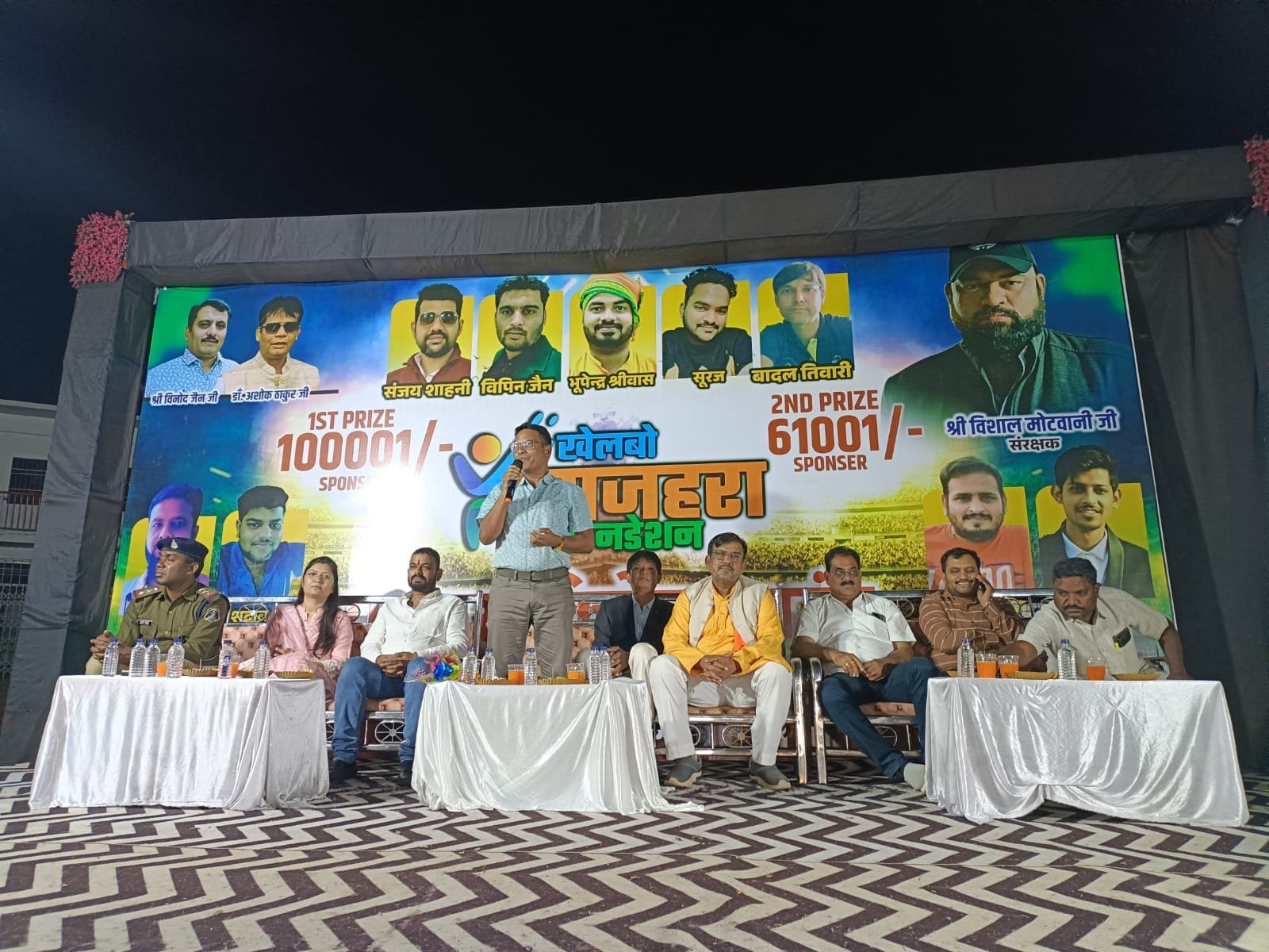 इस मैच के मुख्य अतिथि बालोद जिले के एस आर भगत जी – जिला पुलिस अधीक्षक,विशेष अतिथि के रूप में पूर्व प्रदेश मंत्री भाजपा श्री राकेश यादव ,सौरभ लूनिया,नगर पुलिस अधीक्षक डॉ चित्रा वर्मा,राजहरा व्यपारी संघ के अध्यक्ष गोविंद वाधवानी,,राजहरा थाना प्रभारी सुनील तुर्की ,ज्योति अस्पताल के संचालक डॉ अशोक ठाकुर,पलक ठाकुर, राजहरा प्रीमियर लीग सीजन 4 के संरक्षक विशाल मोटवानी ,राजेश दसोड़े,विनोद जैन, पप्पू पंजवानी सहित अतिथि गण उपस्थित रहे जिला पुलिस अधीक्षक एस आर भगत जी के आगमन से खिलाड़ियों में काफी उत्साह का माहौल रहा साथ ही एस आर भगत जी ने अपने उद्बोधन में जो भी सहयोग रहेगा सुरक्षा में वो दिलाने का वादा किया ।।उद्बोधन की कड़ी में राकेश यादव ने भी खेलबो राजहरा फाउंडेशन की बहुत तारीफ की और ये भी भरोसा दिलाया कि जो भी खेल के लिए मदद लगेगी उसे सरकार से दिलाने का वादा किया। इस टूर्नामेंट में खाबो ग्रुप के द्वारा मैदान पर नित्य नए व्यंजन के साथ उपस्थित होते है एक अलग पहचान बना लिए है खाबो ग्रुप विगत 4 वर्षो में।।