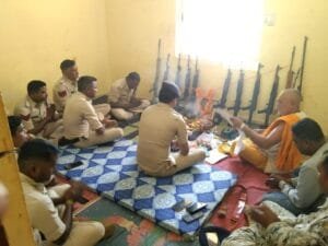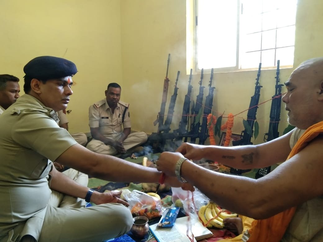विजयादशमी पर्व पर राजहरा थाने में थाना प्रभारी मुकेश सिंह एवम् स्टाफ़ के द्वारा पूरे विधि विधान से की गई शस्त्रों की पूजा ।