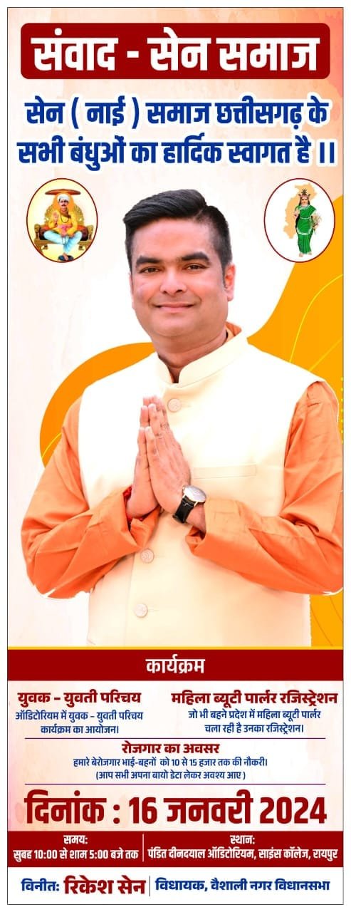 भास्कर न्यूज24/वीरेन्द्र भारद्वाज/दल्ली- भिलाई।वैशाली नगर के विधायक श्री रिकेश सेन जी ने सेन नाई समाज के लोगों के लिए सेन संवाद कार्यक्रम का आयोजन 16 जनवरी को पंडित दीनदयाल ऑडिटोरियम साइंस कालेज रायपुर में रखा है। कार्यक्रम सुबह 10 बजे शुरू होगा और शाम 5 बजे तक चलेगा। गौरतलब है कि श्री रिकेश सेन जी छत्तीसगढ़ में सेन समाज से चुने गए पहले विधायक है। उनके विधायक बनने से समाज में खुशी का माहौल है। विधायक श्रीे रिकेश सेन जी के इस आयोजन को लेकर भी समाज के लोगों में खासा उत्साह है। समाज के हर वर्ग में इस कार्यक्रम को लेकर भारी उत्सुकता है। कार्यक्रम में पूरे छत्तीसगढ़ से बड़ी संख्या में समाज के लोगों की पहुंचने की संभावना है, क्योंकि समाज के लिए इस तरह का आयोजन पहली बार किया जा रहा है।