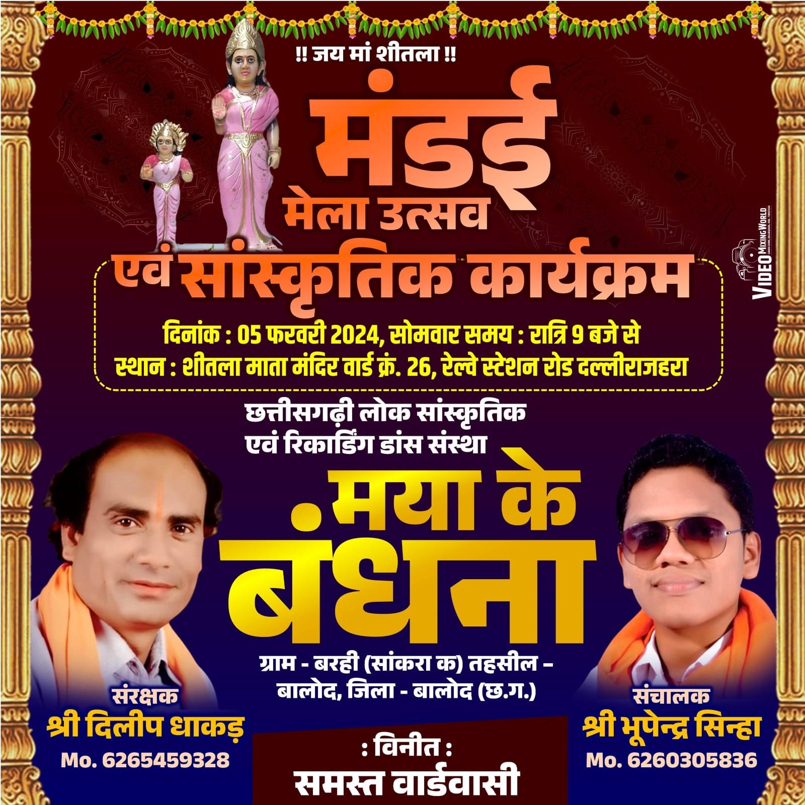 भास्कर न्यूज24/वीरेन्द्र भारद्वाज/ दल्लीराजहरा। नगर के वार्ड 26 रेलवे स्टेशन शीतला मंदिर के समीप 5 फरवरी को मंडई मेला उत्सव का आयोजन किया गया है तथा रात्रि में लोगों के मनोरंजन हेतु छत्तीसगढ़ प्रोग्राम मया के बंधना रखा गया है। आयोजन समित के सदस्यों ने अधिक से अधिक संख्या में उपस्थित होकर इस वार्षिक जलसा का लुल्फ़ उठाने की अपील की है।