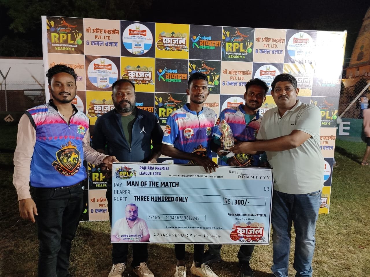 भास्कर न्यूज24/वीरेंद्र भारद्वाज/ दल्लीराजहरा। खेलबो राजहरा फाउंडेशन के द्वारा आयोजित राजहरा प्रीमियर लीग सीजन 4 के आयोजन में 5 वे दिन मंगलवार को पहला मैच स्काई राइडर और एम जे वारियर्स के मध्य खेला गया।स्काई राइडर ने पहले बल्लेबाजी करते हुए निर्धारित 10 ओवर में121 रन बनाए 8 विकेट खोकर वही 121 रन का पीछा करते हुए एम जे वारियर्स ने 9.5 ओवर में 122 रन बना लिए और इस रोमांचक मैच को एम जे वारियर्स ने 3 विकेट से जीत लिया एम जे वारियर्स के कप्तान प्रिंसु ने 59 रन की पारी खेली और प्रिंसू को मैन ऑफ द मैच का पुरुस्कार दिया गया। दूसरा मैच राजहरा इंडियन और सन्नी स्टार के मध्य खेला गया।सन्नी स्टार ने टॉस जीतकर पहले गेंदबाजी करने फैसला लिया और राजहरा इंडियन ने पहले बल्लेबाजी करते हुए निर्धारित 10 ओवर में 112 रन बनाए 7 विकेट खोकर,वही 112 रन का पीछा करते हुए सन्नी स्टार ने 9.4 ओवर में 5 विकेट खोकर यह मैच जीत लिया।। सन्नी स्टार के ऑल राउंडर अविनाश ने 2 बॉल में 12 रन बनाए साथ ही अपने किफायती 2 ओवर में 2 विकेट भी हासिल किया उनके इस बेहरतीय प्रदर्शन से अविनाश को मैन ऑफ द मैच का पुरुस्कार दिया गया। तीसरा मैच थंडर थ्री और दल्ली किंग्स के मध्य खेला गया, दल्ली किंग्स ने पहले बल्लेबाजी करते हुए निर्धारित 10 ओवर में 87 रन बनाए,,,थंडर थ्री ने 87 रन का पीछा करते हुए निर्धारित 10 ओवर में 84 रन ही बना सकी इस 84 रन की पारी में सन्नी भाटिया का अर्धशक भी काम नही आया इस मैच को दल्ली किंग्स ने 3 रन से जीत लिया दल्ली किंग्स के चूरामन को बेहतरीन प्रदर्शन के लिए मैन ऑफ द मैच का पुरुस्कार दिया गया।।इस मैच में विशेष रूप से सभी टीम ऑनर और अतिथि के रूप में विशाल मोटवानी,पप्पू पंजवानी,महावीर चोपड़ा,रवि जायसवाल ,जयदीप गुप्ता मैजिक,लड्डू,सूरज गुप्ता सहित उपस्थित रहे।।