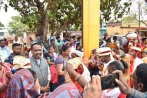 कुसुमकसा उमड़ा बरातियों के स्वागत में जब 74 दूल्हे की बरात एक साथ जब निकला तो पूरे कुसुम के ग्राम वासी दूल्हे और बरातियों के स्वागत में जगह जगह फुल बरसाए और स्वागत गेट पहुंचते ही ग्राम के सरपंच और पंच गण आरती उताकर कर अभिनंदन किए मानो सभी वधुओ का मायका कुसुम ही लग रहा था।