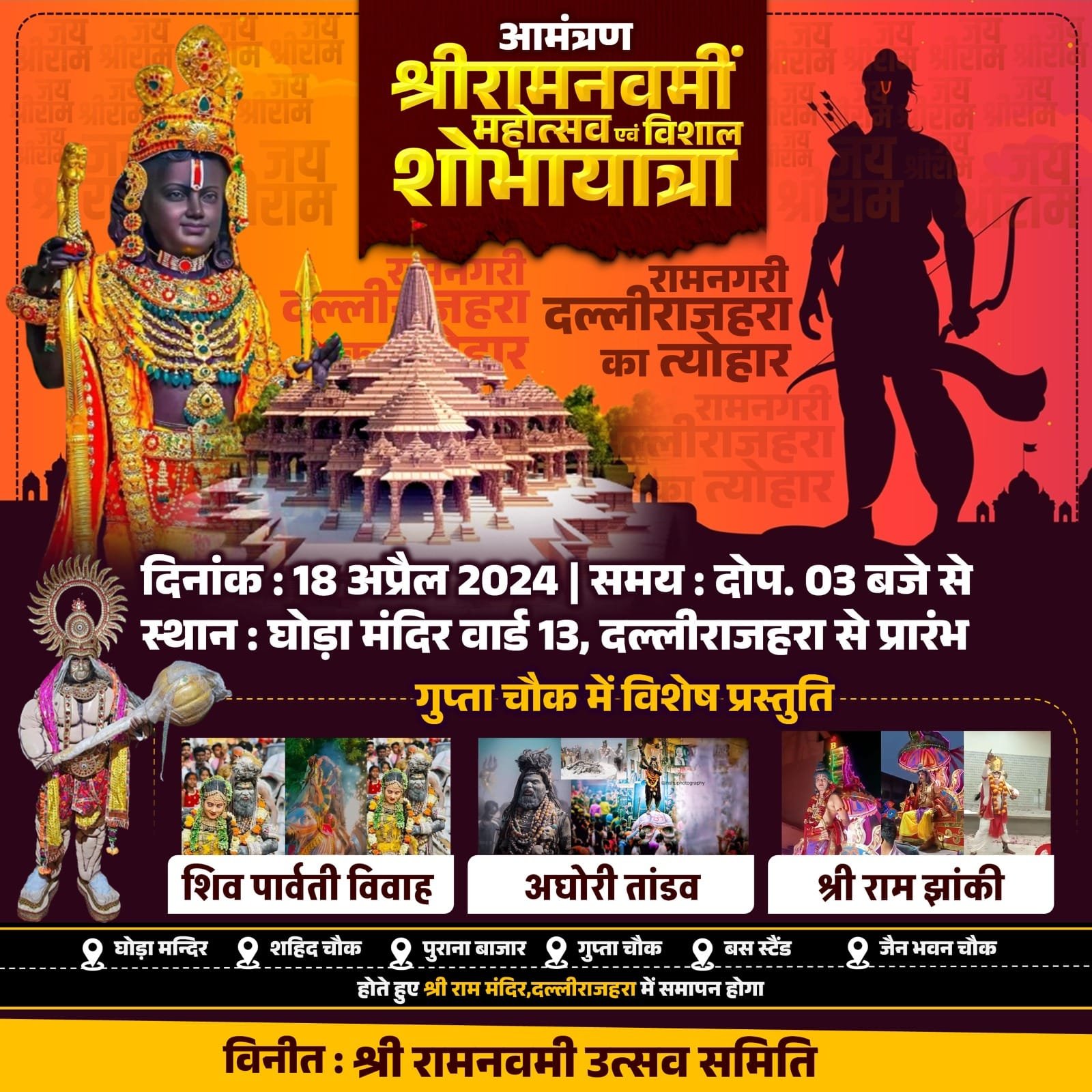 लौह नगरी दल्लीराजहरा में राम नवमी उत्सव समिति के सदस्यों के द्वारा 18 अप्रैल दिन गुरुवार को धार्मिक वेशभूषा प्रतियोगिता ( रिलिजियस फैंसी ड्रेस कॉम्पिटिशन ) का आयोजन रखा गया है। राम नवमी उत्सव समिति के वरिष्ठ सदस्य विशाल मोटवानी ने बताया कि हिन्दू धर्म में पहनावे का एक अलग महत्व है। देवी-देवताओं के साथ-साथ उनके भक्त भी सात्विक परिधान धारण कर इस धर्म की विविधताओं और समानताओं को दर्शाते हैं। आदि काल से चले आ रहे हिन्दू धर्म के पहनावे के क्रम को जारी रखने के लिए इस वर्ष 18 अप्रैल को धार्मिक वेशभूषा प्रतियोगिता का आयोजन किया जा रहा है। जिन किसी भी राम भक्तों को इस धार्मिक वेशभूषा प्रतियोगिता में शामिल होना है वह राम नवमी उत्सव समिति दल्लीराजहरा के सदस्य अरविंद सौरभ ( लक्की ) मोबाइल नम्बर – 9589913831, 088172 07268 के पास अपना नाम लिखवाकर अपना पंजीयन कराते हुए टोकन लेंगे। साथ ही 18 अप्रैल को होने वाले धार्मिक वेशभूषा प्रतियोगिता में अपने टोकन के साथ आएंगे। जिसमे प्रथम टॉप 10 प्रतिभागियों को आकर्षक पुरुस्कार दिया जाएगा तथा सभी प्रतिभागियों को सांत्वना के रूप में पुरुस्कृत किया जाएगा। विशाल मोटवानी ने आगे बताया कि प्रति वर्ष राम नवमी उत्सव समिति दल्लीराजहरा के द्वारा बालोद जिला स्तर पर कार्यक्रम कराया जाता था परन्तु इस वर्ष राम नवमी को प्रदेश स्तरीय कार्यक्रम की रूप रेखा दी गयी है। जिसमे छत्तीसगढ़ एवम अन्य अलग अलग राज्यो की झांकियां सम्मिलित होगी। यह झांकिया नगर दल्लीराजहरा के वार्ड क्रमांक 13 घोड़ा मंदिर से होते हुए पुराना बाजार, गुप्ता चौक, नया बस स्टैंड चौक, श्रमवीर चौक, जैन भवन चौक होते हुए राम मंदिर पहुँचेगी। विशाल मोटवानी ने सभी नगर वासियों एवम प्रदेशवासियों से अपील की है कि झांकी एवम रामनवमी के कार्यक्रम में अपनी उपस्थिति दर्ज कराते हुए कार्यक्रम को सफल बनायें।