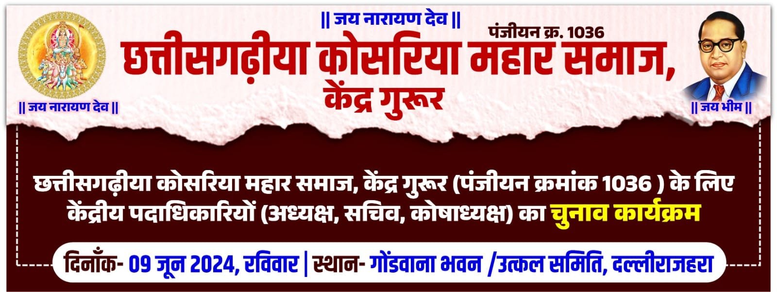 भास्कर न्यूज24/वीरेंद्र भारद्वाज/ दल्लीराजहरा । छत्तीसगढ़ कोशरिया महार समाज केंद्र गुरुर पंजीयन क्रमांक – 1036 द्वारा पहली बार दल्लीराजहरा गोड़वाना भवन जैन भवन चौक में दिनाँक 9 जून को महासम्मेलन आयोजित किया गया है। जहा 22 क्षेत्रों के(1000 लोग )कोशरिया महार समाज के पदाधिकारी व समाज के व्यक्ति आएंगे।सम्मेलन में केंद्रीय पदाधिकारियों का चुनाव होना है। जहां अध्यक्ष पद हेतु उमीदवार मेहत्तर राम सोरदे जिला कांकेर, चुनाव चिन्ह साइकल छाप,आनंद राम बघेल जिला बालोद केंद्र गुरुर क्षेत्र, चुनाव चिन्ह बरगद पेड़ कोषाध्यक्ष पद हेतु उमीदवार पोसन लाल सोनवानी केंद्र गुरुर क्षेत्र चुनाव चिन्ह झोपड़ी छाप, अभय कुमार केशरी केंद्र जिला कांकेर, चुनाव चिन्ह हैंड पंप छाप , सचिव पद हेतु उमीदवार कमल किशोर वारदे क्षेत्र गुरुर , चुनाव चिन्ह सीड़ी छाप, गैंदराम रामटेके केंद्र गुरुर क्षेत्र , फावड़ा छाप,छत्तीसगढ कोशारिया महार समाज केंद्र दल्लीराजहरा द्वारा होने वाला यहां पहला सम्मेलन है। जो अत्यंत सौभाग्य एवं गौरव शाली है।छत्तीसगढ़ कोसरिया महार समाज के समस्त परिक्षेत्र के पदाधिकारियों व समाज के व्यक्तियों से अपील है कि इस सम्मेलन में भारी संख्या में आकर अपना महत्तवपूर्ण योगदान दे और अपना वोट उस व्यक्ति को दे जो सक्षम हो और उस पद का दुरुपयोग ना करके समाज के हित में कार्य करे और समाज को आगे बढ़ाने में अपना महत्तवपूर्ण योगदान दे निरंतर आगे बढ़े और समाज को भी आगे बढ़ाने की कोशिश करे।
