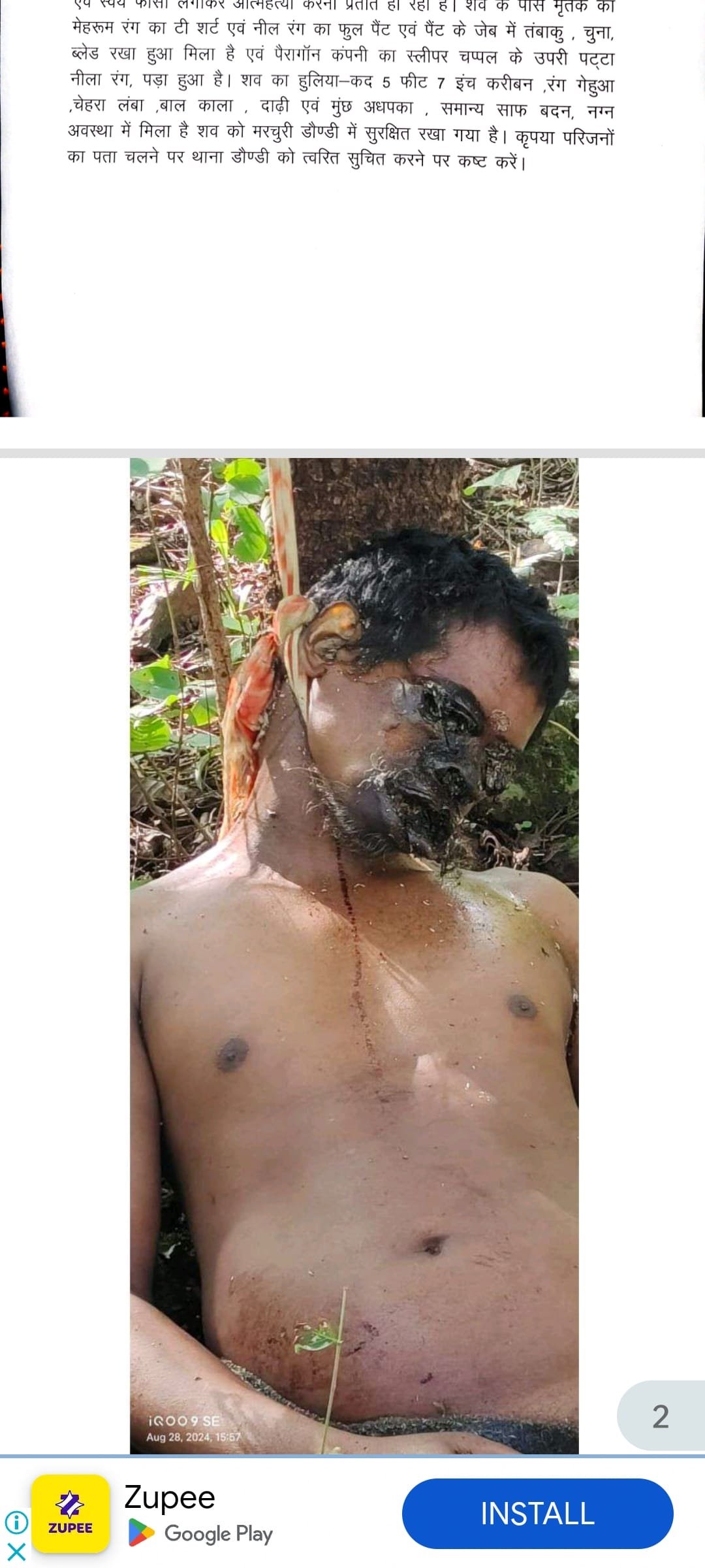 भास्कर न्यूज 24/वीरेन्द्र भारद्वाज/दल्लीराजहरा। थाना डौण्डी के अंतर्गत को ग्राम कोकान पहाड़ी के जंगल में पुलिस को अज्ञात शव मिला है। थानाप्रभारी मुकेश सिंह ने बताया कि डौण्डी के मर्ग क्रमांक 51/2024 धारा 194 बी.एन.एस.एस. के मामले में आज दिनांक 28.08.24 को सुचनाकर्ता कोषण कुंजाम पिता बलदेव कुंजाम उम्र 42 साल निवासी कोकान थाना डौण्डी जिला बालोद (छ०ग०) की सुचना पर डौण्डी पुलिस के द्वारा ग्राम कोकान पहाड़ी मंदिर के पीछे जंगल में जाकर देखने पर कर्रा पेड़ के डंगाल में छिंटदार संतरा रंग के गमछा में एक अज्ञात् पुरूष उम्र करीबन 40 साल का नग्न अवस्था में फांसी लगा हुआ मिला है जिसके दोनों आंख, मुंह, नाक में कीड़ा लगा हुआ व बदन में मख्खीयाँ भिनभिना रहा था, देखने पर घटना 03-04 पुर्व का होना देखने में विक्षिप्त जैसा लग रहा है एवं स्वयं फांसी लगाकर आत्महत्या करना प्रतीत हो रहा है। शव के पास मृतक का मेहरूम रंग का टी शर्ट एवं नील रंग का फुल पैंट एवं पैंट के जेब में तंबाकु, चुना, ब्लेड रखा हुआ मिला है एवं पैरागॉन कंपनी का स्लीपर चप्पल के उपरी पट्टा नीला रंग, पड़ा हुआ है। शव का हुलिया-कद 5 फीट 7 इंच करीबन रंग गेहुआ चेहरा लंबा बाल काला दाढ़ी एवं मुंछ अधपका समान्य साफ बदन, नग्न अवस्था में मिला है शव को मरचुरी डौण्डी में सुरक्षित रखा गया है। कृपया परिजनों का पता चलने पर थाना डौण्डी को त्वरित सुचित करने पर कष्ट करें।।