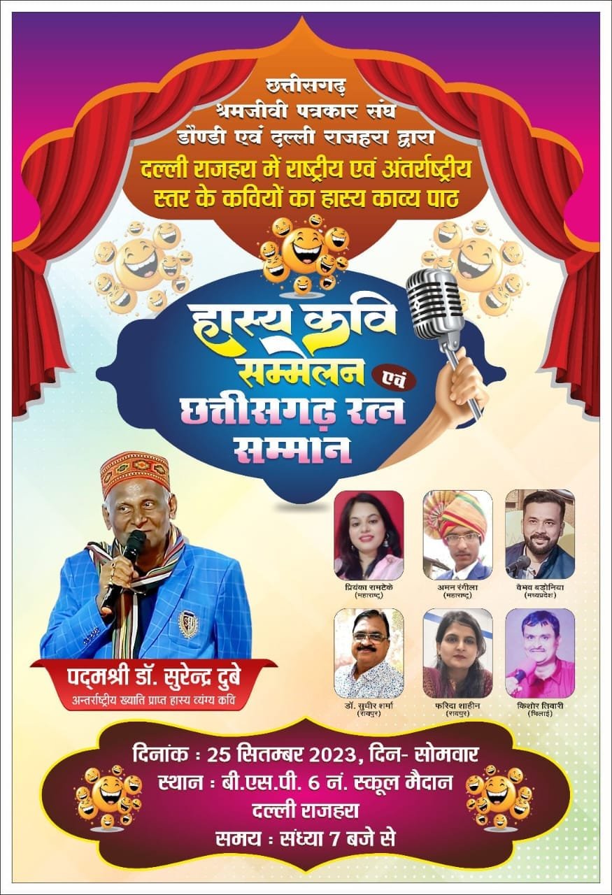 पद्मश्री डॉ सुरेंद्र दुबे का 25 सितम्बर को बीएसपी स्कूल क्रमांक 6 के मैदान में होगा हास्य कवि सम्मेलन। साथ ही छत्तीसगढ़ रत्न सम्मान समारोह का आयोजन किया गया है।
