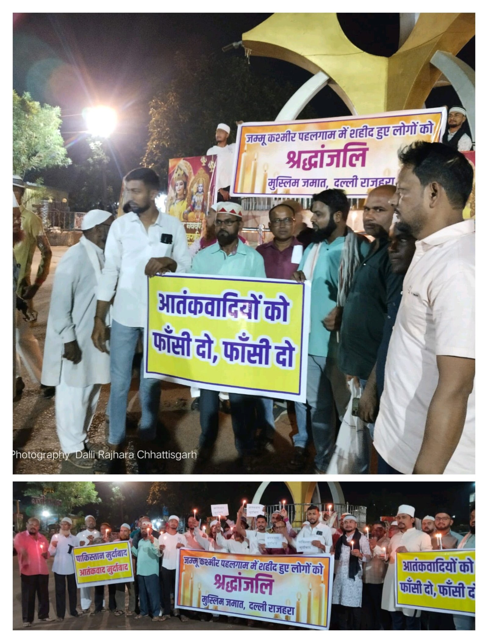 भास्कर न्यूज 24/विरेन्द्र भारद्वाज/दल्लीराजहरा। कश्मीर के पहलगाम में पर्यटकों पर हुए आतंकवादी हमले और इस निर्मम हत्या के विरोध में मुस्लिम समाज दल्ली राजहरा द्वारा स्थानीय जैन भवन चौक में कैंडल मार्च निकाल कर घोर विरोध प्रदर्शन करते हुए आतंकवादियों के फांसी की मांग की गई । इस दौरान मुस्लिम समाज के युवाओं ने अपने वक्तव्य में कहा की भारत में हिंदू मुस्लिम की एकता को बिगड़ने की जो नापाक आतंकी साजिश की गई उसका देश भर के लोगों ने मुंहतोड़ जवाब दिया है। आगे वक्तव्य में देश के प्रधानमंत्री नरेंद्र मोदी और गृह मंत्री अमित शाह से मांग की कि इस घटना में लिप्त आतंकवादियों और उनके संगठनों पर नकेल कसे और उन पर सख्त से सख्त कार्रवाई कर उन्हें फांसी की सजा दी जाने की मांग की। इस दौरान पाकिस्तान मुर्दाबाद आतंकवाद मुर्दाबाद के नारे लगाए गए । इस दौरान शेख नय्युम, मौलाना हकीक साहब, एमडी फारूक, नवाब बडगुजर, अब्दुल जावेद, शकील हुसैन, शेख अफजल,मुमताज कुरैशी, अफसर कुरैशी, नदीम बडगूजर, हाजी सनव्वर साहब, मुस्ताक भाई, असलम, कामील, आदिल, आजाद, शमशेर अली, लाल मोहम्मद, कासिम कुरैशी, इमरान अहमद, इमरान राजा, नागुर भाई, निसार भाई, लालू भाई, आतिफ भाई,सलामत,दानीश भाई,राजा,मुस्ताक अंसारी,कादिर भाई,हसिब खान साथ ही बड़ी संख्या में समाज के लोग उपस्थित थे ।