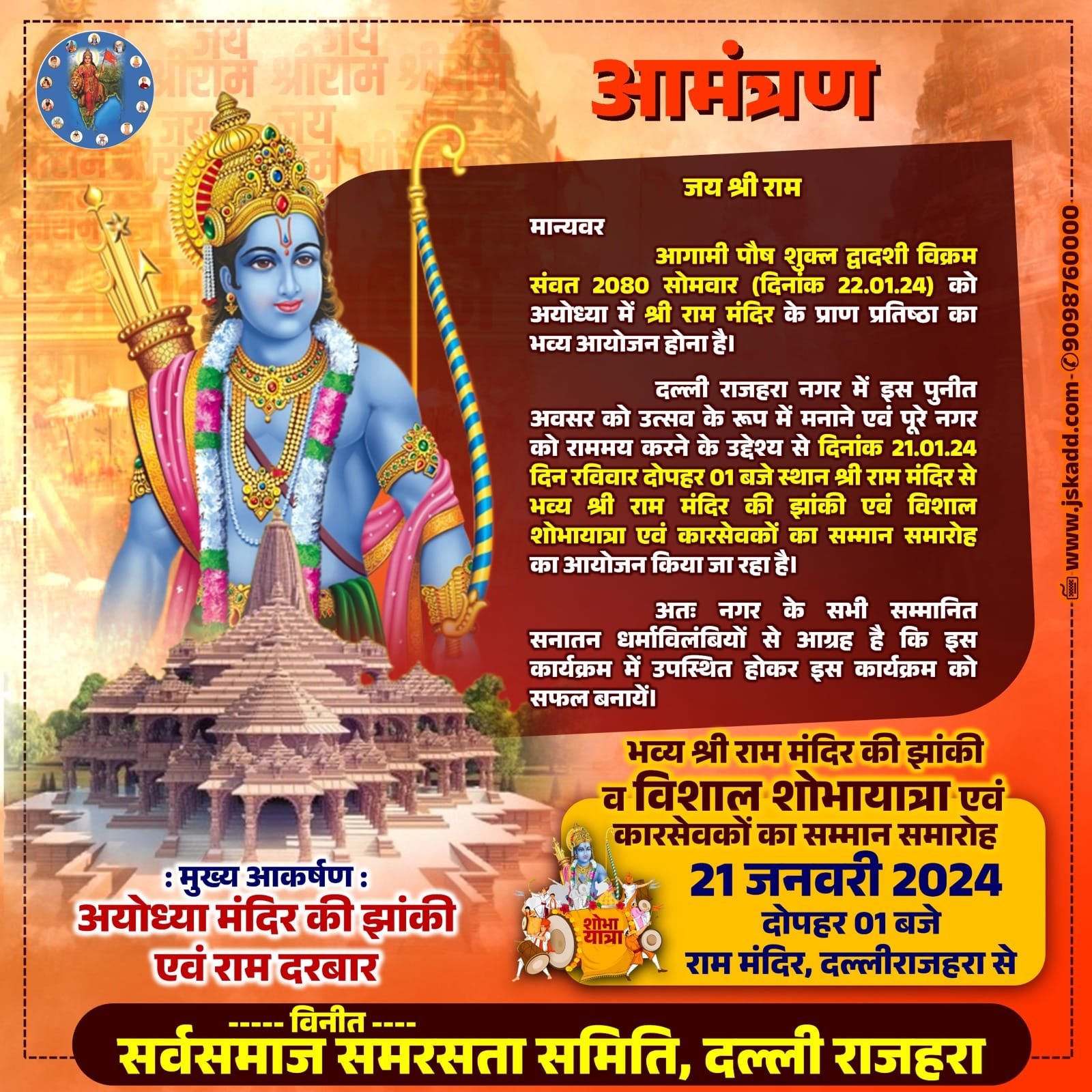 श्री राममंदिर से 21 जनवरी को भव्य श्री राम मंदिर की झांकी एवं विशाल शोभायात्रा व कार सेवकों का सम्मान समारोह ।