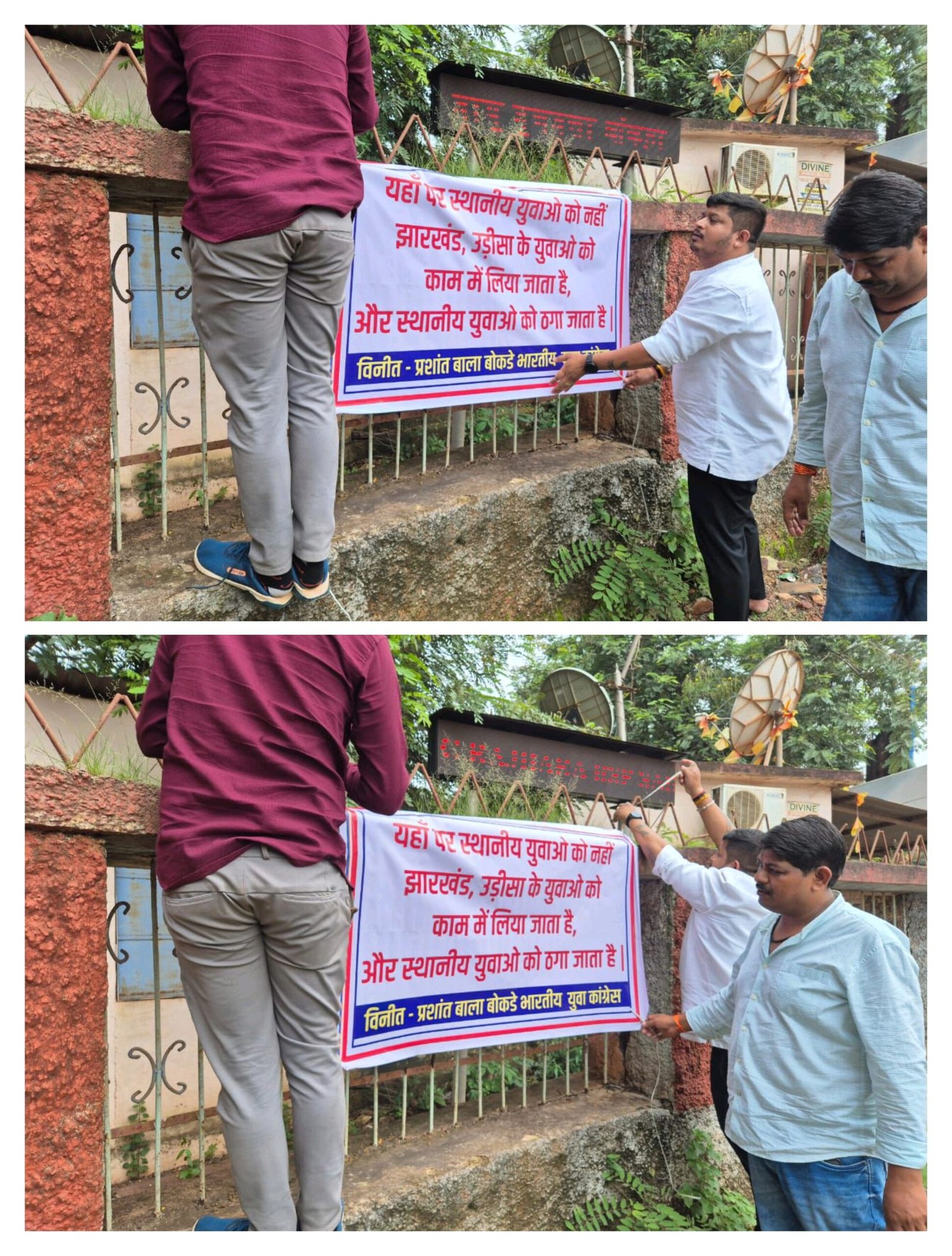 भास्कर न्यूज़ 24/ वीरेंद्र भारद्वाज/ दल्लीराजहरा। कांग्रेस नेताओ के द्वारा बीएसपी प्रबंधन के खिलाफ बड़ा आरोप लगते हुए पोस्टऱ जारी किया गया। बीएसपी प्रबंधन के द्वारा स्थानीय युवाओ के साथ दोहरी निति अपनाते हुए स्थानीय युवाओ के साथ छल किया जा रहा है जिसके विरोध में कांग्रेस नेता रवि जायसवाल प्रशांत बोकडे के नेतृत्व में आज बीएसपी प्रबंधन के मुख्य गेट में पोस्टर चिपका कर आइना दिखाने का काम किया गया। आज के इस अभियान में महेंद्र अप्पू ,भोला मानिकपुरी, टीनू पांडेय, भरत देवांगन,मुकेश देवांगन,नितेश बाम्बेश्वर मौजूद थे।