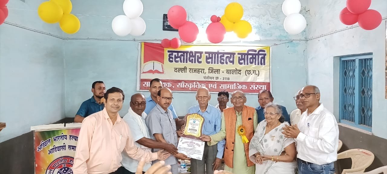 भास्कर न्यूज24/वीरेन्द्र भारद्वाज/दल्लीराजहरा। हस्ताक्षर साहित्य समिति दल्ली राजहरा के तत्वावधान मे 27 अगस्त को हल्बा समाज भवन मे समिति के संस्थापक स्व बंगाली प्रसाद ताम्रकर की जयंती पर उनके सुपुत्र सुशील कुमार ताम्रकर के सौजन्य से साहित्यिक समारोह आयोजित किया गया । इस पावन अवसर पर वरिष्ठ साहित्यकार संतोष ठाकुर ‘सरल’ द्वारा रचित पुस्तक ‘मेरा देश महान’ का विमोचन मुख्य अतिथि शास. महाविद्यालय खेरथा के सहायक प्राध्यापक ( हिन्दी) रूमलाल भुआर्य एवं उपस्थित अन्य अतिथियों के करकमलों से किया गया । कार्यक्रम का शुभारंभ माँ सरस्वती की पूजा अर्चना कर किया गया । सरस्वती वंदना समिति के वरिष्ठ साहित्यकार गोविन्द कुट्टी पणिकर ने प्रस्तुत की। स्वागत भाषण कार्यक्रम की अध्यक्षता कर रहे हस्ताक्षर साहित्य समिति के अध्यक्ष संतोष ठाकुर ने दिया एवं स्वरचित पुस्तक के संदर्भ मे जानकारियां दी एवं मार्मिक कविता का पाठ किया। साहित्य के क्षेत्र मे उल्लेखनीय योगदान के लिए वरिष्ठ साहित्यकार ज्ञानेन्द्र सिंह, नारायण राव एवं घनश्याम पारकर को *हस्ताक्षर साहित्य सम्मान* से सम्मानित किया गया । सुशील कुमार ताम्रकर ने समिति के संस्थापक स्व. बंगाली प्रसाद ताम्रकर के जीवन पर प्रकाश डाला । विशेष अतिथि के आसंदी पर बिलासपुर से पधारे वरिष्ठ साहित्यकार उमाशंकर मिश्र, वरिष्ठ साहित्यकार मोहनलाल चतुर्वेदी गुरुर, शिरोमणी माथुर दल्ली राजहरा, कन्हैया लाल बारले ग्राम कोचेरा, देव जोशी संबलपुर, जे आर महिलांगे दल्ली राजहरा एवं देवनारायण नगरिहा विराजमान रहे। मुख्य अतिथि रूमलाल भुआर्य ने साहित्य के अर्थ पर प्रकाश डाला । उन्होंने ने बताया कि साहित्य समाज का दर्पण होता है , एवं लोकभावना का प्रतिनिधित्व करता है। साहित्य देशकाल के अनुरूप परिष्कृत होता है। विशेष अतिथि मोहनलाल चतुर्वेदी ने जीवन मे साहित्य के महत्व को बताया एवं छत्तीसगढ़ी मे रचना पाठ किया- *नइ पूछय बहू बेटा नइ पूछय भाई* ।