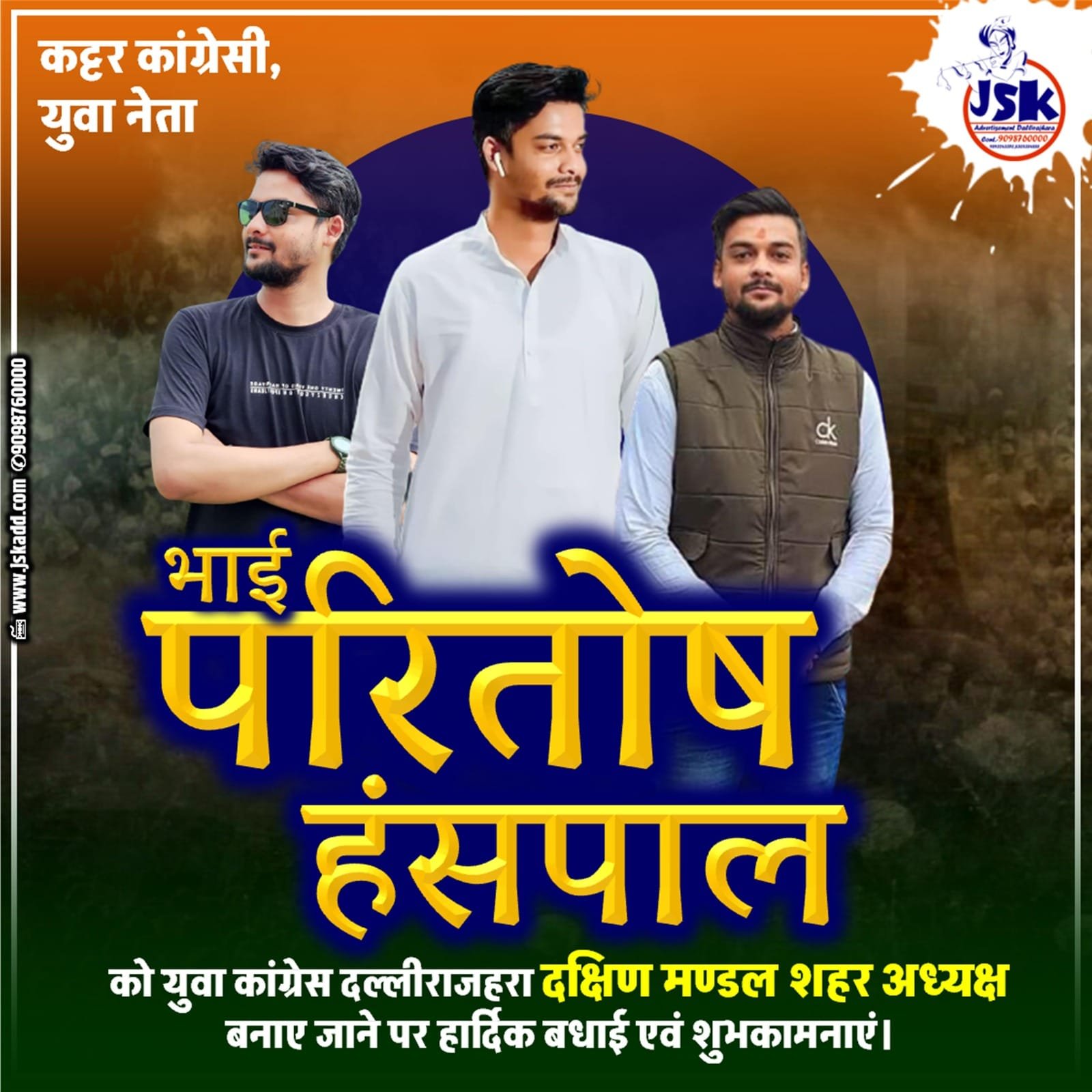 भास्कर न्यूज24/वीरेन्द्र भारद्वाज/दल्लीराजहरा। आगामी विधानसभा चुनावों को मद्देनजर देर रात कांकेर लोकसभा युवा कांग्रेस प्रभार शशांक शर्मा ने युवा कांग्रेस प्रदेश महासचिव एवम छत्तीसगढ़ प्रभारी डॉ पलक वर्मा एवम प्रदेशाध्यक्ष आकाश शर्मा तथा लोकसभा प्रभारी द्वे श्री शशांक शर्मा एवम ज़ीशान खान व जिला प्रभारी श्जल्फिकार सिद्दिकी और बालोद युकां जिलाध्यक्ष प्रशांत बोकडे की सहमति से बालोद जिला युवा कांग्रेस कार्यकारिणी जारी की गई , जिसमे लंबे वक्त से कांग्रेस पार्टी के लिए ततपर युवाओं को पदभार सौंपा गया । इस कार्यकारिणी में परितोष हंसपाल को युवा कांग्रेस दक्षिण मंडल का शहर अध्यक्ष नियुक्त किया गया , जिससे शहर के युवाओं में खुशी की लहर है ।अपने खास व्यक्तित्व के लिए मशहूर परितोष हंसपाल की नियुक्ति पर शहर भर के युवाओं ने बधाई प्रेषित की है । नगर पालिका अध्यक्ष शीबू नायर के खास माने जाने वाले परितोष हंसपाल को इस ज़िम्मेदारी का मिलना , उनका लंबे वक्त से संगठन हित मे कार्य करना बताया जा रहा है ।